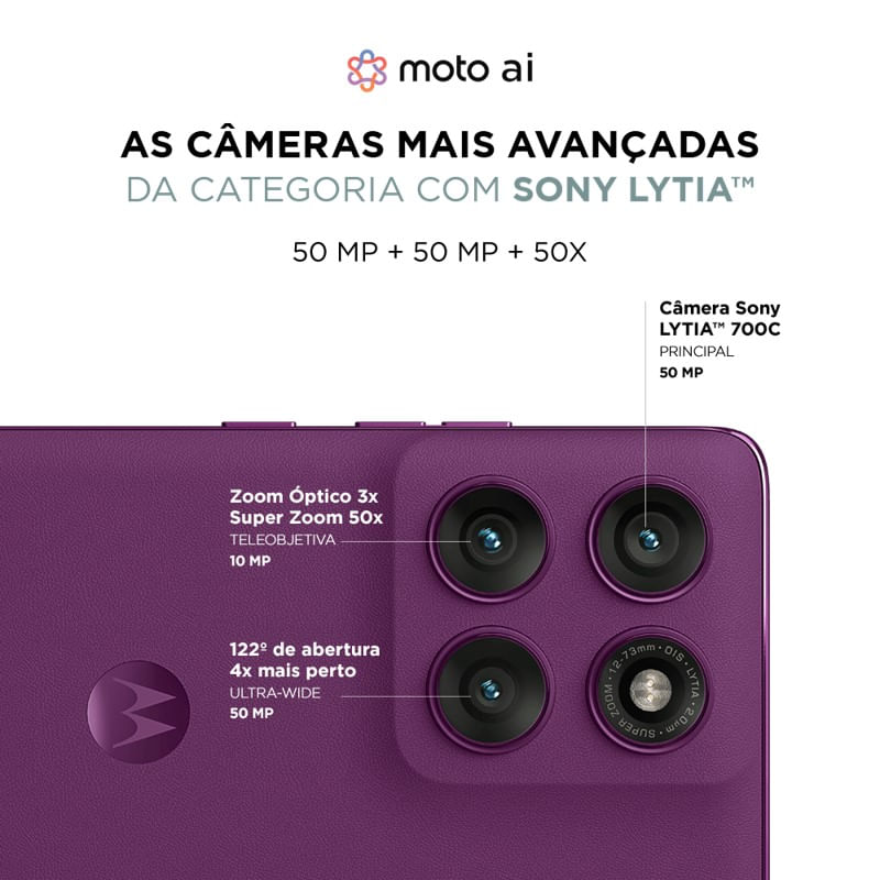 Capture momentos incríveis com a câmera Sony LYTIA™ 700C de 50MP, equipada com tecnologia moto ai, que garante fotos nítidas e vibrantes mesmo em condições de pouca luz. O zoom óptico de 3x e o Super Zoom de 50x permitem fotografar de longe com detalhes impressionantes. Além disso, a câmera de selfie de 50MP com tecnologia Quad Pixel eleva suas fotos a um nível profissional.